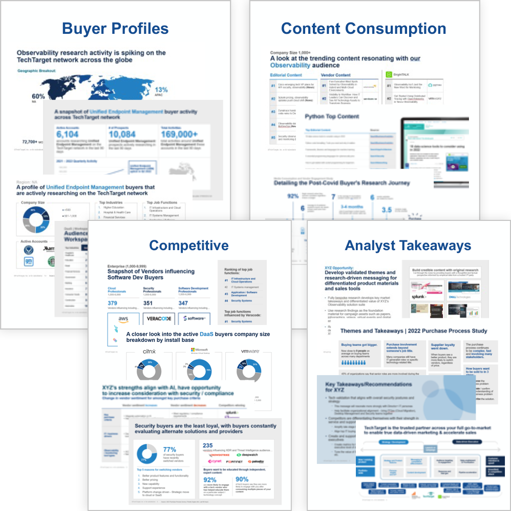 Enterprise Strategy Group’s annual advisory program includes access to a deep library of tech market intelligence and a team of market analysts who bring unique perspective from their hands-on experience in product development, marketing and sales enablement. They understand the problems their clients must solve, and they leverage our detailed demand-side research and TechTarget’s proprietary buyer intent data to identify market trends, competitive dynamics and buyer triggers critical to tech businesses. These experts help ensure a client’s strategy and execution are aligned by providing actionable insights that can be combined with our extensive custom content creation and enablement services to deliver better results.