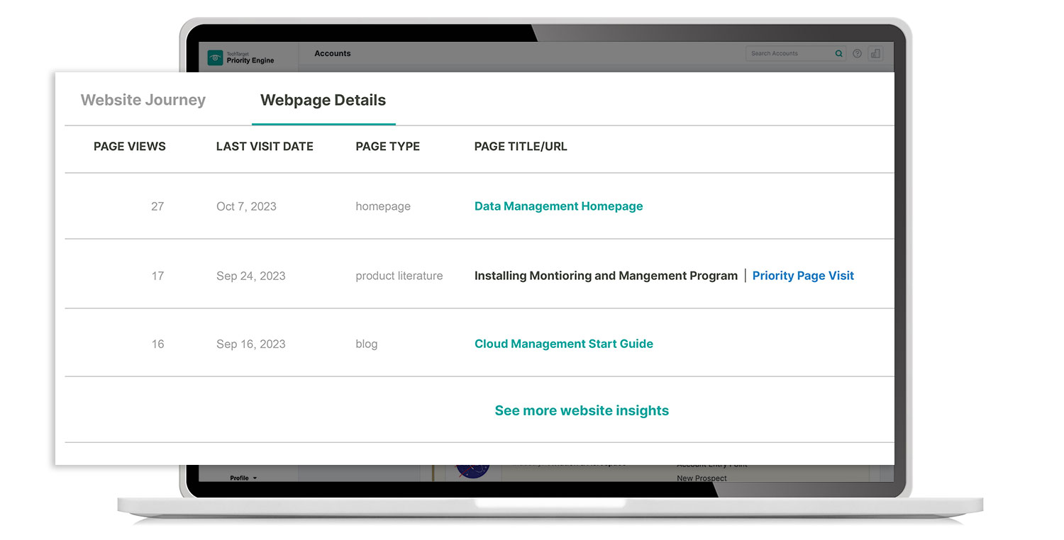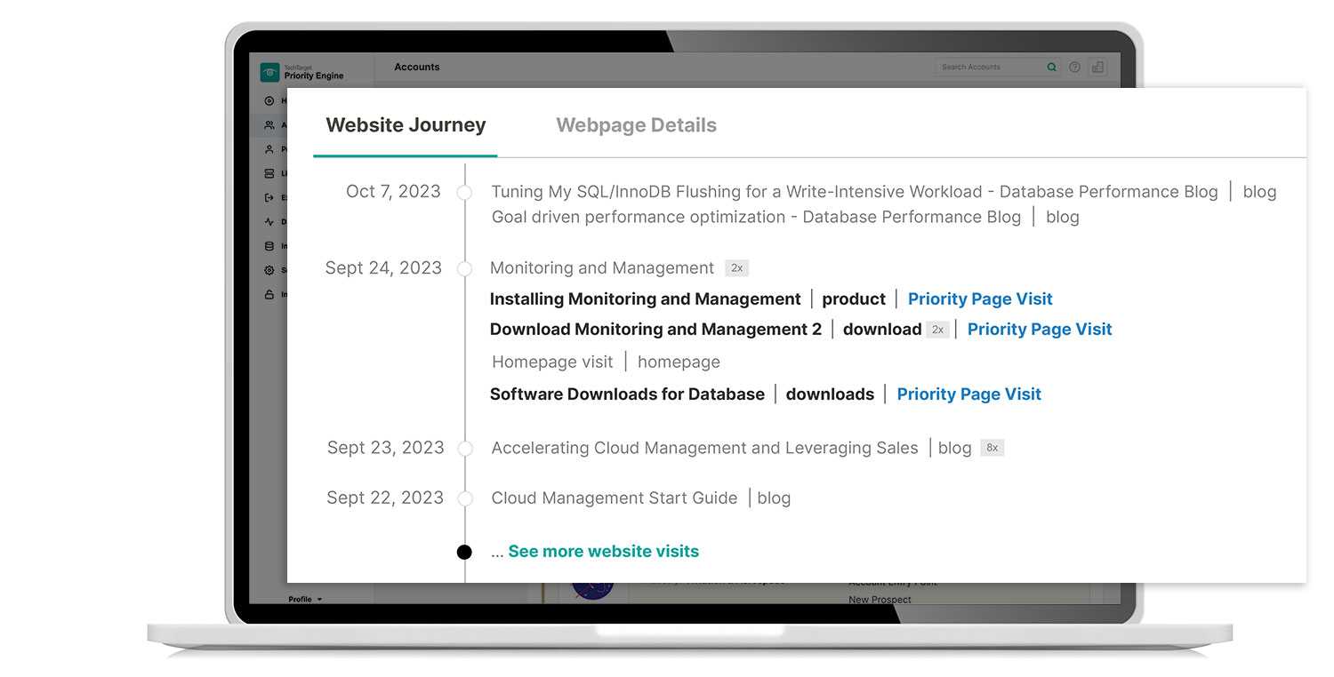 Priority Engine’s Inbound Converter shows the entire timeline of account activity on your site and the exact pages visited. It flags when they engage with high-priority pages—all in real time for more productive outreach.