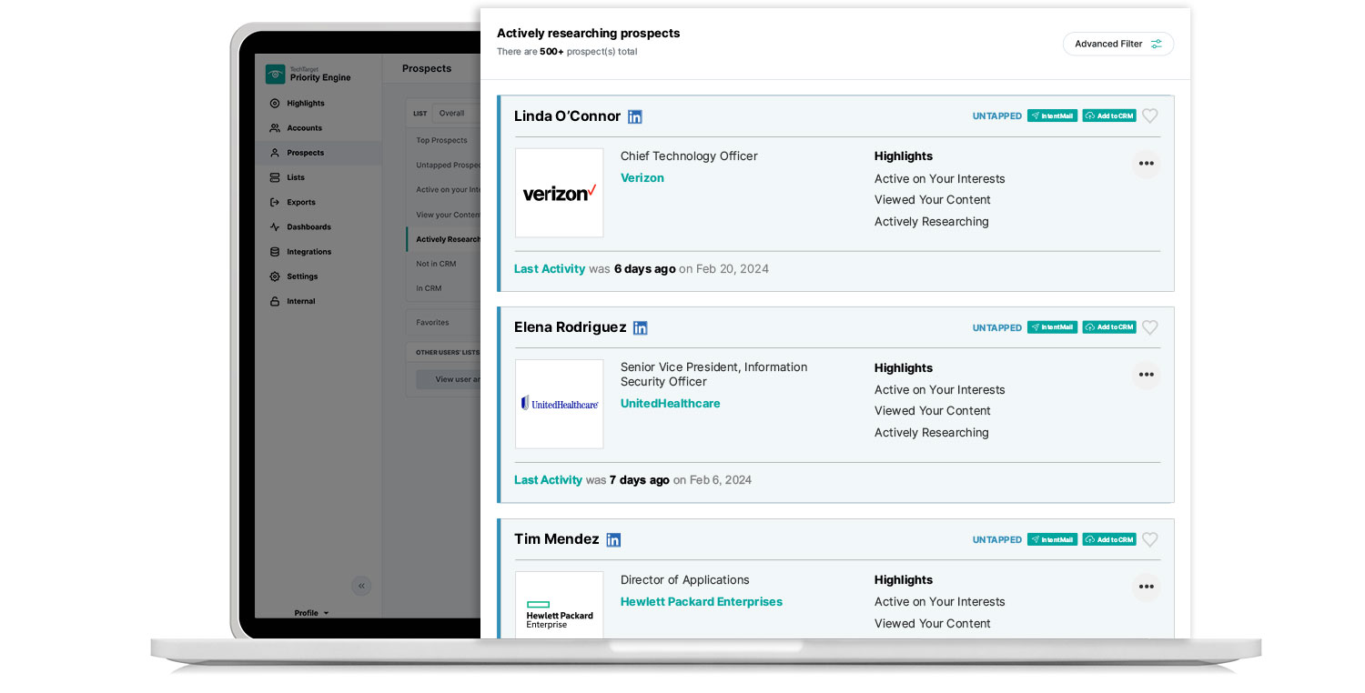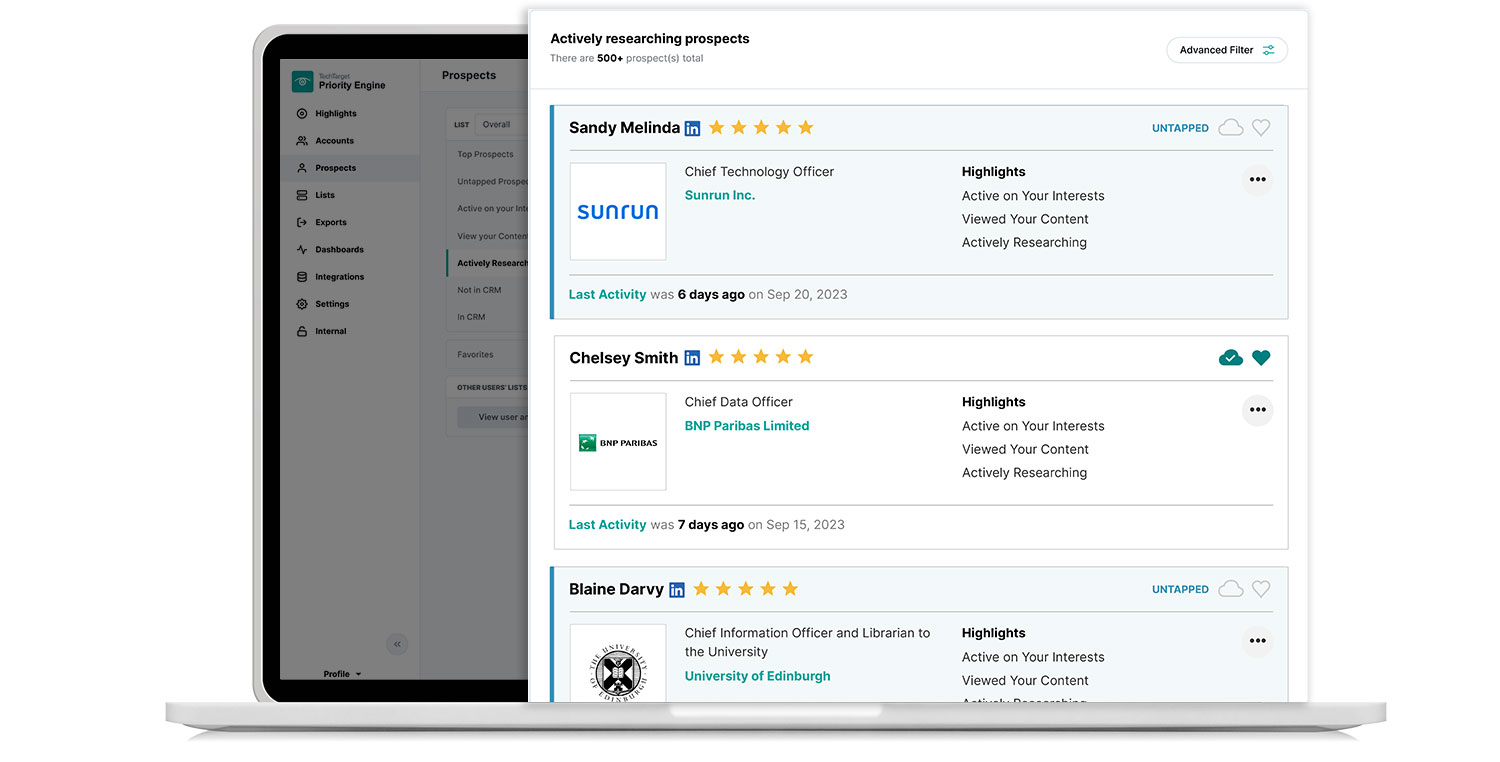 Priority Engine™ automatically finds and prioritizes the accounts and prospects that are actually in-market for your solutions. It ranks them for you in order of their propensity to buy.