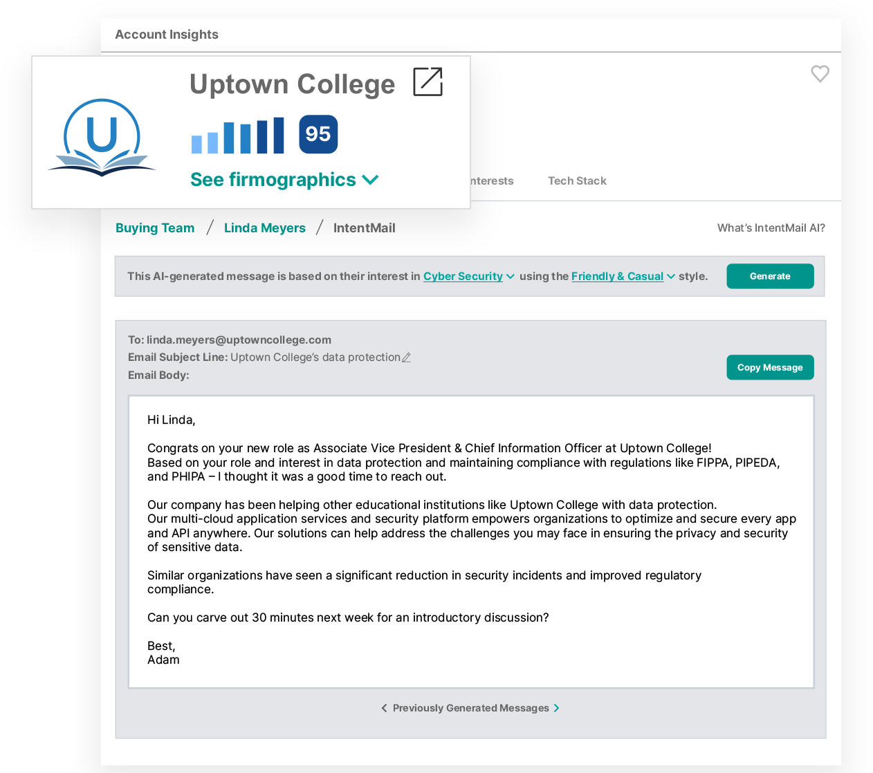 TechTarget takes the guesswork out of outbound prospecting. While cold contact providers can only provide you with a list of personas to try, TechTarget’s Priority Engine automatically identifies active prospects: real people displaying real purchase behaviors in your specific technology category. And IntentMail AI™ makes personalization super easy.