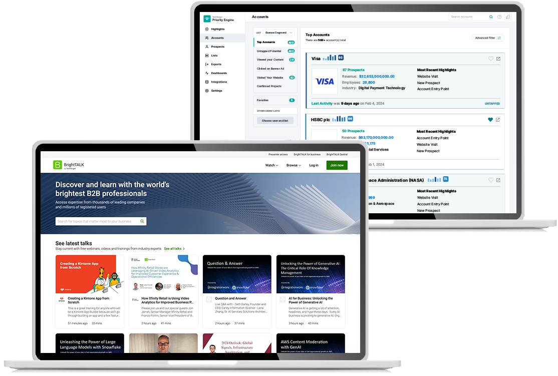 Our award-winning Priority Engine™ intent data solution precisely identifies the people and the topics that your teams should be focused on to win. Our BrightTALK® engagement platform supports more of the video material and events that B2B buyers prefer than anyone else. Both connect directly to you to strengthen every program and bolster every objective.